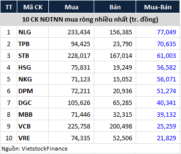 Khối ngoại mua ròng hơn 670 tỷ đồng trên sàn HOSE, trong đó VPB và DXG là hai mã được mua ròng nhiều nhất. Trên sàn HNX, khối ngoại bán ròng nhẹ gần 1 tỷ đồng, trong đó VKC là mã bị bán ròng nhiều nhất.