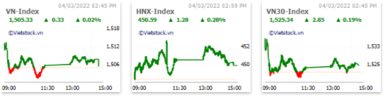 Kết thúc phiên giao dịch, VN-Index nhích nhẹ 0.33, đạt mức 1,505.33 điểm; HNX-Index tăng 1.28 điểm, đạt 450.59 điểm. Độ rộng toàn thị trường nghiêng về bên mua với 658 mã tăng và 381 mã giảm. Rổ VN30 phân hóa với 14 mã giảm, 14 mã tăng và 2 mã tham chiếu.