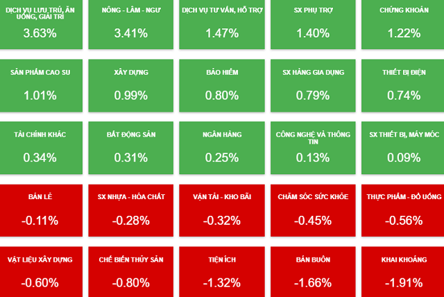 Dịch vụ lưu trú, ăn uống, giải trí đang là ngành tăng mạnh nhất thị trường với mức tăng 3.11%. Ngược lại, bán buôn là ngành giảm mạnh nhất với mức giảm 1.02%.