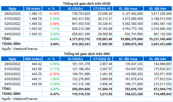 Khối lượng giao dịch của VN-Index ghi nhận cuối phiên đạt hơn 924 triệu đơn vị, với giá trị là 29.4 ngàn tỷ đồng. HNX-Index ghi nhận khối lượng giao dịch đạt hơn 139 triệu đơn vị, với giá trị giao dịch đạt hơn 3.9 ngàn tỷ đồng.