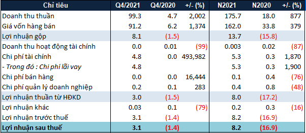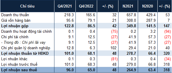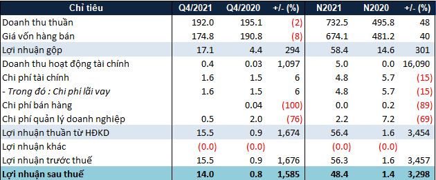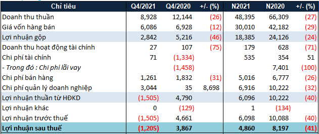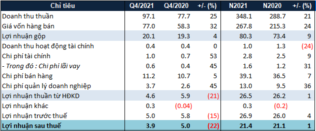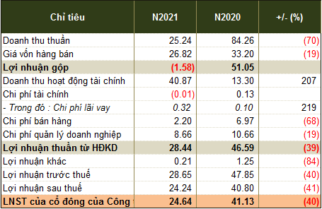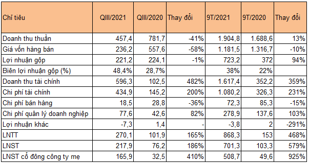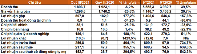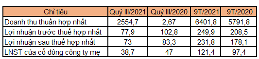 Lũy kế 9 tháng, doanh thu thuần hợp nhất đạt 6.401,8 tỷ, tăng 10% so với cùng kỳ năm trước. Lợi nhuận sau thuế đạt 231,8 tỷ, tăng 30% và phần thuộc cổ đông công ty mẹ đạt 121,4 tỷ, tăng 24% so với cùng kỳ 2020.