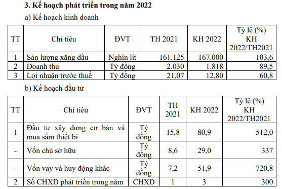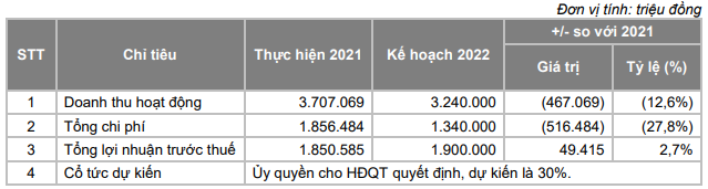 Kế hoạch năm 2022 với doanh thu giảm 12,6% trong khi lợi nhuận trước thuế là 1.900 tỷ đồng, tăng 2,7%.Cổ tức dự kiến cho năm 2021 là 30% bằng cổ phiếu.