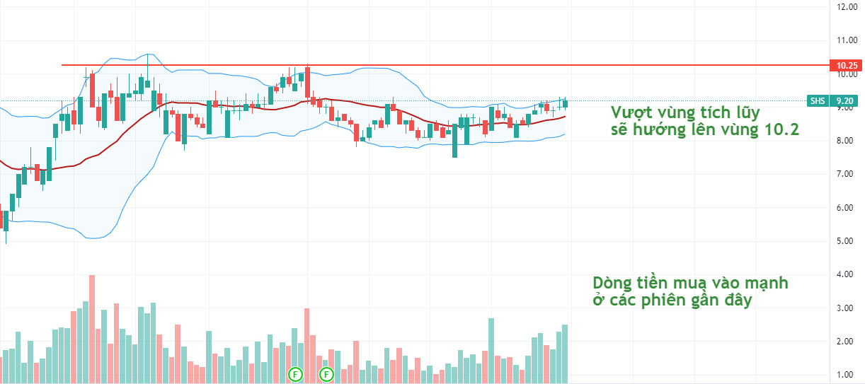 SHS: Đang tích lũy rất chặt quanh vùng 9-9.2 với lực mua mạnh trong các phiên tăng, lực mua yếu trong các phiên giảm.