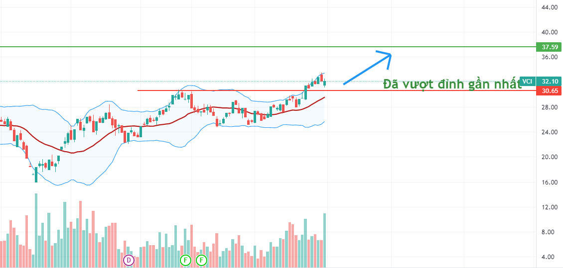 VCI: Đã vượt đỉnh cũ 30, là mã vượt đỉnh cũ đĩnh cũ đầu tiên trong nhóm Chứng Khoán. Hiện tại đang tiếp tục điều chỉnh. Giá mục tiêu 37 trong ngắn hạn.
