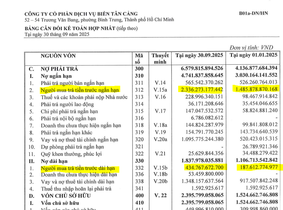 Khách hàng “Quân đội”: TOS có mối quan hệ mật thiết và là đối tác chiến lược của Quân chủng Hải quân. Bằng chứng là tại cuối Q3/2025, khoản mục “người mua trả tiền trước” từ Quân chủng Hải Quân lên đến 1.916 tỷ đồng, tăng hơn 500 tỷ so với đầu năm. Đây là nguồn doanh thu “chắc chắn” khổng lồ, đảm bảo công việc cho công ty trong nhiều năm tới.