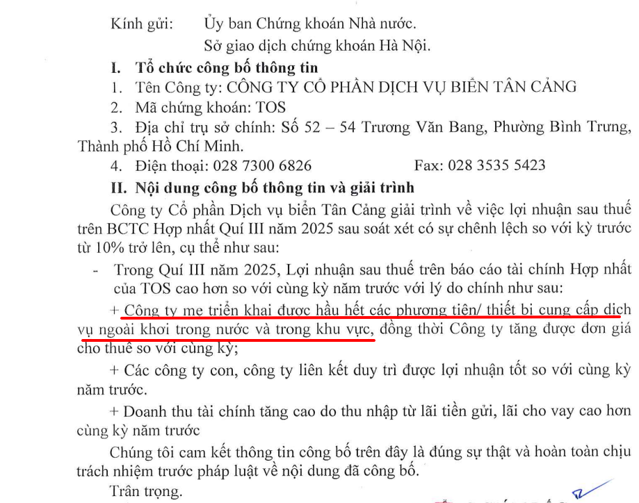 Quý 3/2025 (Mới nhất): TOS tiếp tục gây bất ngờ với doanh thu 1.357,7 tỷ đồng (+61.6% YoY) và LNST đạt ~325 tỷ đồng, gấp 3 lần cùng kỳ năm 2024.
