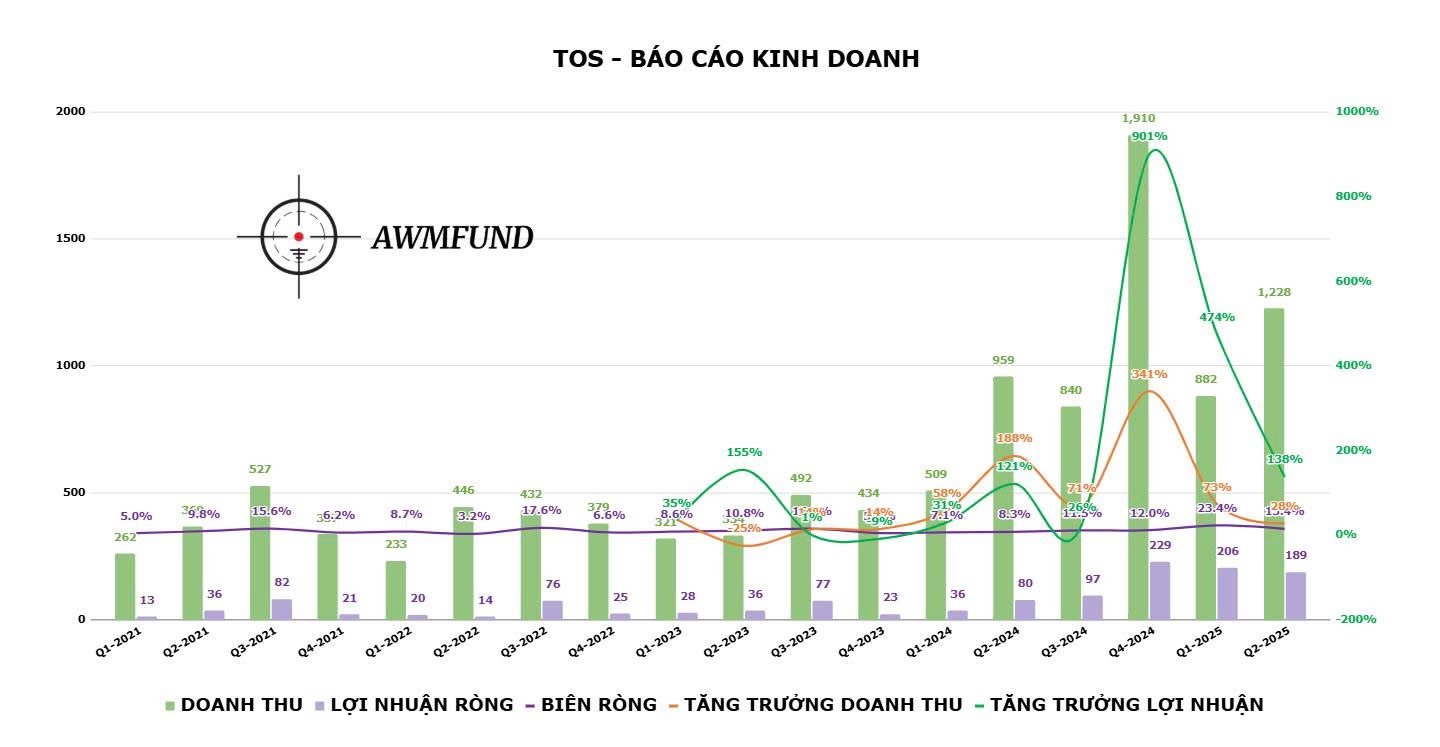 Phân tích kỹ thì Q1/2025: doanh thu 881,5 tỷ (+73%), lãi >206 tỷ (+470%) – 3 quý tăng liên tiếp, tài sản ròng vọt lên ~5.523 tỷ. Mùa biển lặng sắp tới mà TOS tận dụng được thì EPS sẽ càng mạnh – cần follow sát