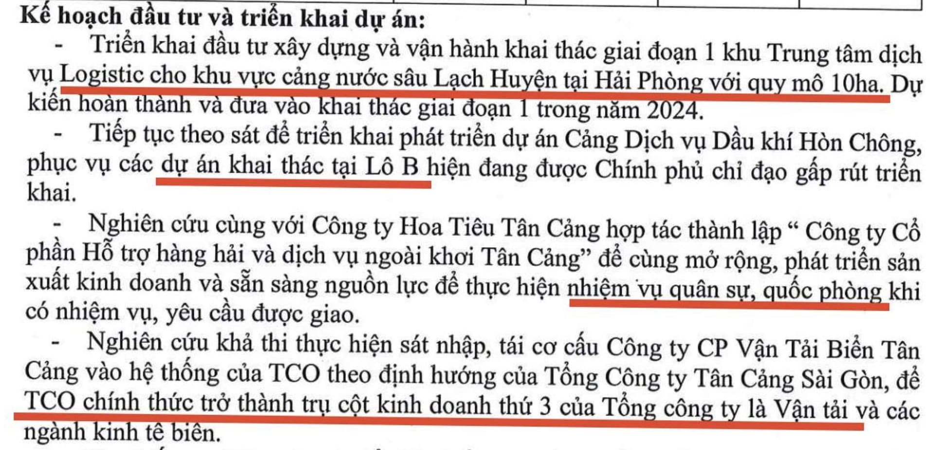 Trong kỳ, TOS đã chính thức tham gia góp vốn vào công ty vận tải biển Tân Cảng, TanCangShipping, với tỷ lệ 43.8% vốn và trở thành công ty liên kết. Việc mua cổ phần này nằm trong chiến lược của TOS trở thành trụ cột thứ 3 của Tân Cảng Sài Gòn là Vận tải biển và các ngành kinh tế biển.