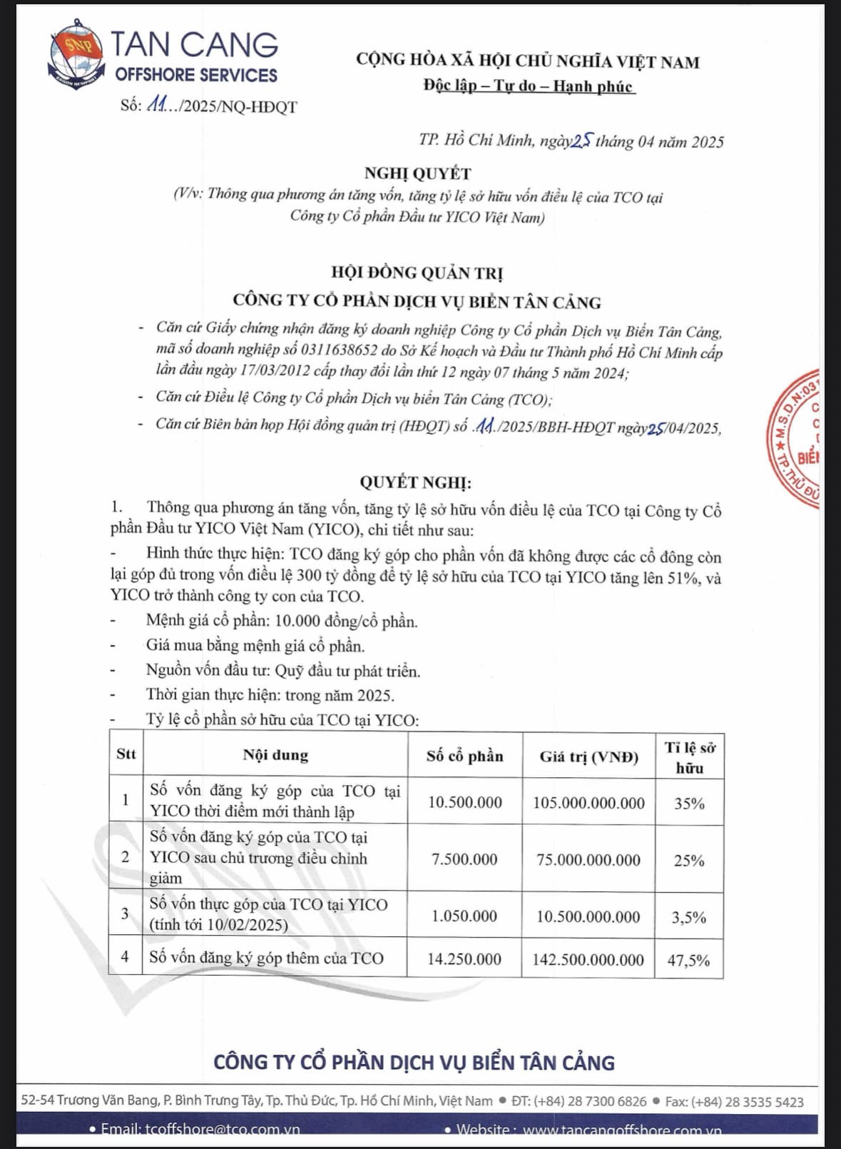 Đại hộ cổ đông thông qua tăng vốn năm 2024 và triển khai thực hiện trong năm 2024, tuy nhiên do Tân Cảng có 36% vốn trong TOS bắt buộc phải xin ý kiến Bộ QP để tăng vốn, do thủ tục giải quyết chậm đến 4/2025 Cục TC BQP mới có văn bản chấp thuận.