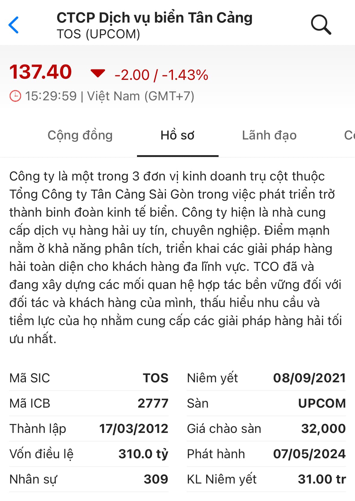 Cổ phiếu TOS cũng ghi nhận diễn biến tích cực. Từ mức giá 56.000 đồng/cổ phiếu cuối tháng 10/2024, thị giá TOS đạt đỉnh gần 152.000 đồng/cổ phiếu cuối tháng 3/2025, tăng xấp xỉ 180% trong vòng 1 năm. Hiện tại, cổ phiếu đang giao dịch quanh mức 140.000 đồng/cổ phiếu.