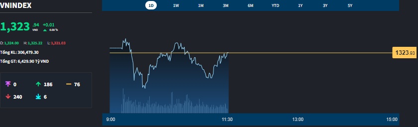 Trong khi đó, tổng tăng của VN-Index cuối phiên sáng chỉ là 0,01 điểm, phản ánh rõ nét sức mạnh từ nhóm trụ. Độ rộng chỉ số chỉ có 186 mã tăng/240 mã giảm thể hiện diễn biến giảm giá đã quay lại với số đông. Ngay trong rổ VN30, độ rộng cũng chỉ đạt 9 mã tăng/16 mã giảm nhưng chỉ số vẫn tăng 0,71 điểm. Ảnh hưởng từ việc kéo trụ ban đầu tạo được chút hưng phấn. Độ rộng sàn HoSE có thời điểm thể hiện vượt trội với 218 mã tăng/183 mã giảm. Dù vậy lực mua suy yếu theo thời gian đã khiến giá không duy trì được độ cao ổn định.