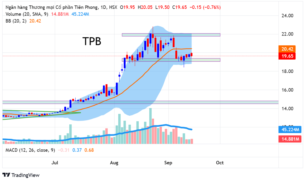 TPB đang giao dịch trong một biên giá từ 19-22 khá giống với VNINDEX khi di chuyển trong vùng 1600-1700. Có thể thấy khi TPB về gần vùng biên dưới hỗ trợ ở 19 thì thanh khoản giảm và biên độ dao động giá trong phiên cũng thu hẹp lại. Đây là tín hiệu tích cực, cho thấy không có nhiều áp lực bán khi giá tiến sát vùng hỗ trợ. TPB cũng đã có một phiên test lại điểm hỗ trợ vào ngày 11 tháng 9, khi trong phiên có lúc thủng vùng 19 nhưng cuối phiên được kéo lên lại, cho thấy dòng tiền đã đỡ giá khi về vùng hỗ trợ tiềm năng.