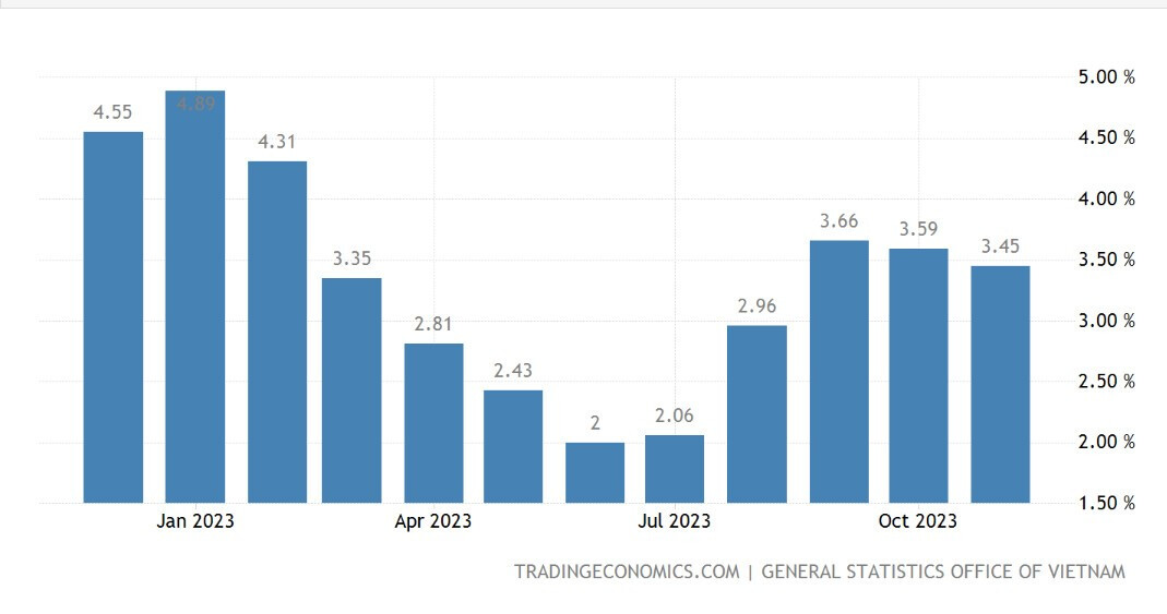 Lạm phát cơ bản Việt Nam tháng 11/2023 tăng 0.16% so với tháng trước, tăng 3.15% so với cùng kỳ năm trước. Bình quân 11 tháng năm 2023, lạm phát cơ bản tăng 4.27% so với cùng kỳ năm 2022, cao hơn mức tăng CPI bình quân chung (tăng 3.22%). Nguyên nhân chủ yếu do bình quân giá xăng dầu trong nước 11 tháng năm 2023 giảm 12.12% so với cùng kỳ năm trước,