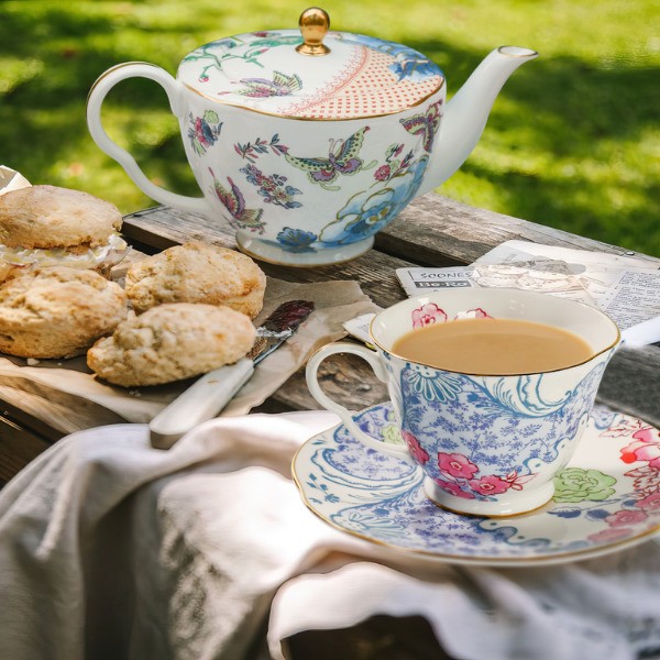 Bàn tiệc trà ngoài sân vườn là khung cảnh quen thuộc trong mỗi buổi tiệc trà chiều kiểu Anh