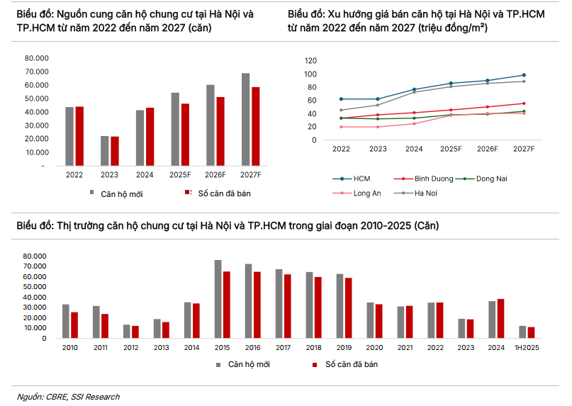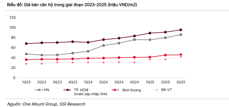 Tại Hà Nội: ghi nhận 21.100 căn hộ mới, tăng 10% svck , nhưng điểm nhấn là Q3/2025 ghi nhận lượng giao dịch cao nhất theo quý kể từ 2018 (+91% so với quý trước). Giá bán trung bình đã chạm mốc 86 triệu đồng/m² (+23% svck).