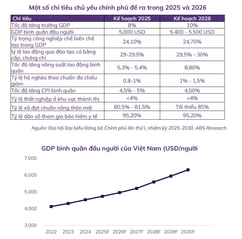 - Chính phủ đặt ra mục tiêu tăng trưởng rất cao cho năm 2026 với mức GDP bình quân đạt 10%, cao hơn nhiều so với mức 7,5-8,5% trong kế hoạch giai đoạn 2026 - 2030