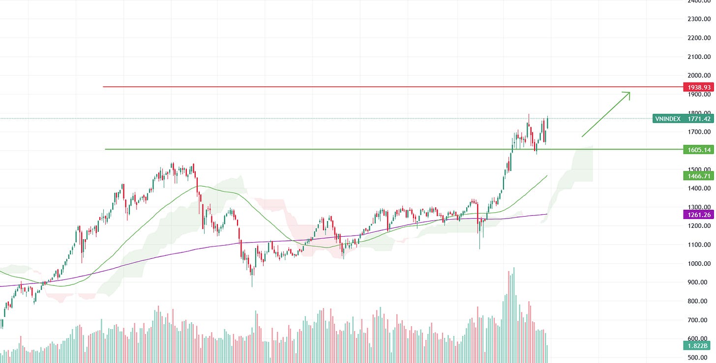 - Sau đó, VN-Index quay trở lại xu thế tăng giá cấp 1 tiếp diễn, hướng tới vùng điểm số 1875 – 1940. Mốc hỗ trợ đối với kịch bản này tại vùng giá 1600 điểm.
