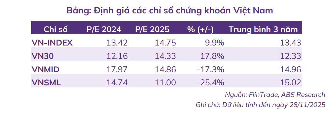 - Xét theo các nhóm cổ phiếu, nhóm cổ phiếu vốn hóa vừa và nhỏ đang có định giá hấp dẫn nhất ở mức P/E 11,0x, thấp hơn 26,8% trung bình 3 năm và thấp hơn 25,4% bình quân toàn thị trường.