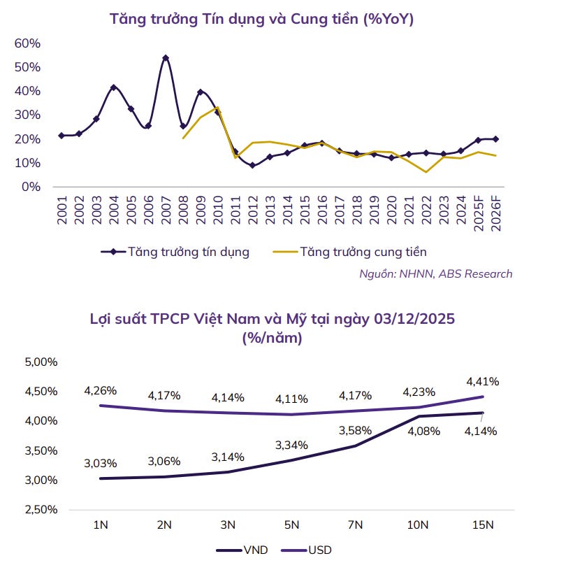 - Chúng tôi dự báo tăng trưởng tín dụng cả năm 2026 sẽ ở mức 18% - 20% khi Chính phủ và NHNN định hướng hỗ trợ tăng trưởng, đồng thời dự kiến áp dụng cơ chế mới thay thế hạn mức tín dụng truyền thống