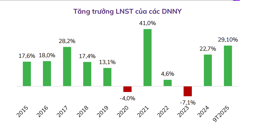 - Năm 2025 chứng kiến lợi nhuận toàn thị trường quay lại xu hướng tăng trưởng ổn định sau giai đoạn hồi phục từ nền thấp trước đó.