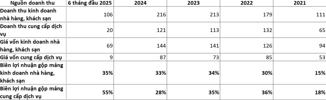 Tài sản khách sạn của IJC đã khai thác ổn định trở lại hậu Covid, có mức biên lợi nhuận 3 năm gần nhất khoảng 33%, 2 quý đầu 2025 có biên lợi nhuận 35%, doanh thu ổn định ở mức 210 tỷ/ 1 năm, lợi nhuận gộp ổn định ở mức 70 tỷ/ 1 năm. Ngành khai thác khách sạn nói chung khá ổn định, ít rủi ro về dòng tiền, do đó ở mảng khách sạn, ước tích IJC sẽ có được đều đặn mỗi năm 70 tỷ lợi nhuận gộp từ mảng khách sản.