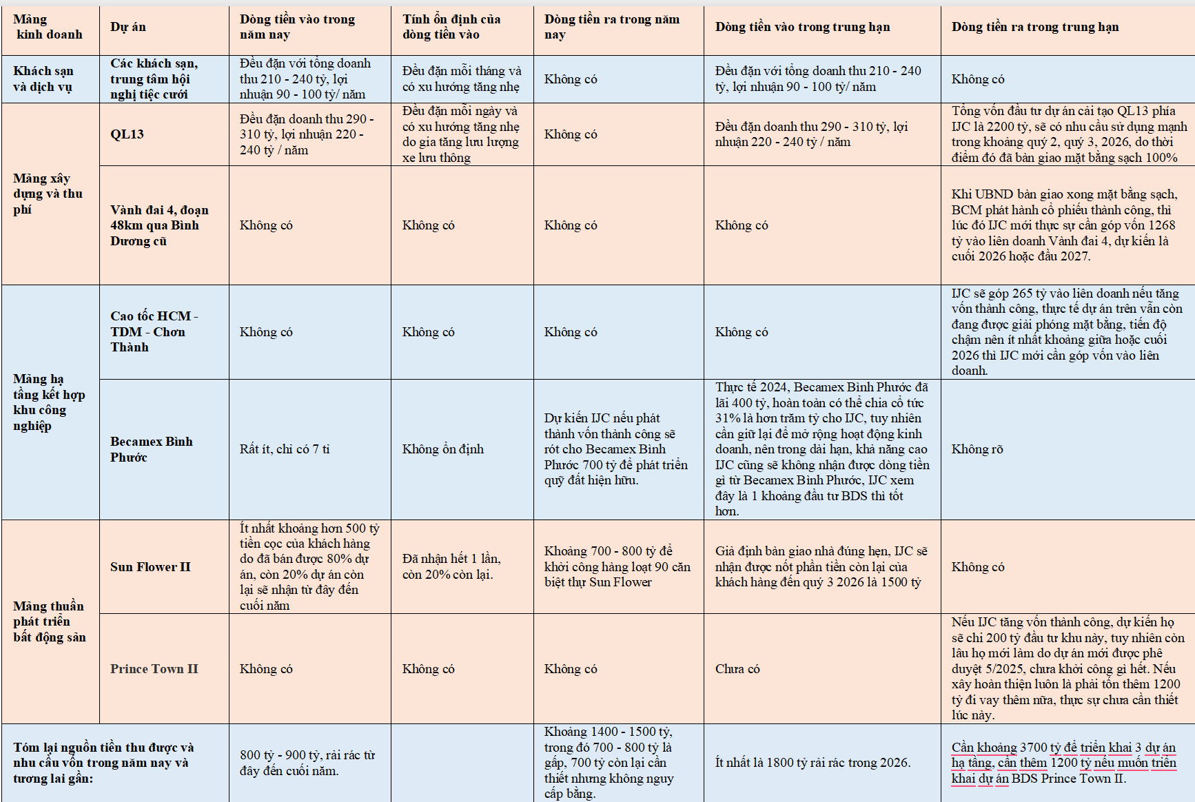 Dòng tiền của dự án: Theo BCTC Q2-2025, IJC mới chỉ góp vào liên doanh 20 tỷ, tương đương 20% vốn điều lệ, dự kiến khi huy động vốn thành công đợt tăng vốn sắp tới, IJC sẽ góp 265 tỷ vào liên doanh, tuy nhiên thực tế thì dự án chỉ mới đang ở bước giải phóng mặt bằng, UBND Thành phố HCM đặt mục tiêu hết năm nay là có mặt bằng sạch, tuy nhiên tiến độ vẫn chưa rõ ràng, nên dự kiến trong năm nay dự án sẽ chưa được triển khai, nên sẽ không cần dòng tiền cho dự án này trong ngắn hạn.