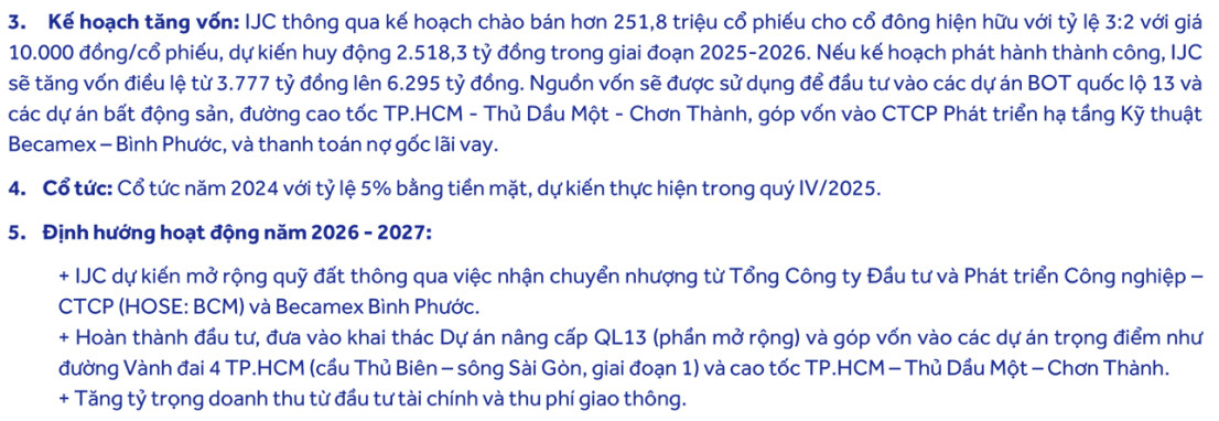 Đầu năm 2025, cổ đông IJC thông qua quyết định tăng vốn thông qua chào bán hơn 251,8 triệu cổ phiếu với giá 10.000 đồng/cổ phiếu, dự kiến sẽ thu về gần 2.520 tỷ đồng, qua đó, vốn điều lệ của công ty sẽ tăng từ 3.777 tỷ đồng lên thành 6.296 tỷ đồng. Nguồn vốn thu được, công ty dự định chi hơn 700 tỷ đầu tư hạ tầng Becamex Bình Phước, hơn 700 tỷ cải tiến QL13 đã được đề cập trên, 250 tỷ góp vốn đầu tư cao tốc HCM - Thủ Dầu Một - Chơn Thành, hơn 200 tỷ đầu tư xây dựng Khu nhà ở Prince Town II (mở rộng), 350 tỷ thanh toán nợ ngân hàng, lãi phát hành.