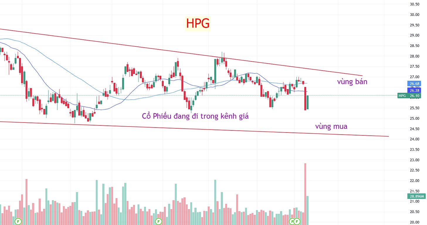 - HPG đang đi trong kênh giá 24-27. Tuy nhiên phiên ngày 10/2/2025 xuất hiện một phiên giảm mạnh kèm khối lượng lớn nên Cổ Phiếu cần thời gian tích lũy xây nền trở lại.