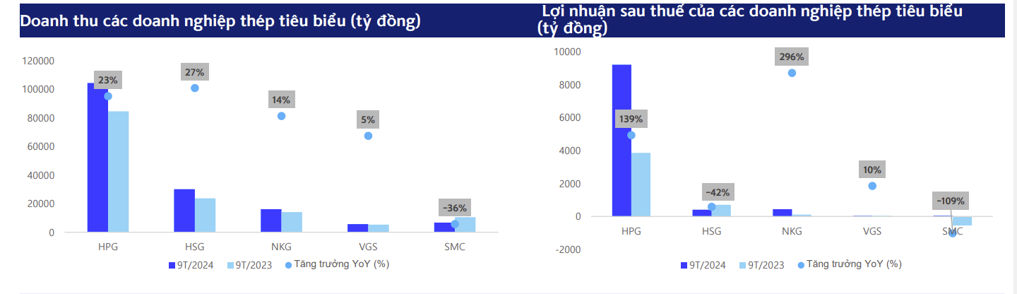 - Bức tranh kinh doanh của ngành thép 9T/2024 nhìn chung ghi nhận sự phục hồi nhẹ so với cùng kỳ ở nhóm các doanh nghiệp đầu ngành (HPG, HSG, NKG). Dẫn đầu cuộc đua là “ông trùm” HPG với doanh thu gần 104,364 tỷ đồng (+23.4% YoY), lợi nhuận hơn 9,210 tỷ đồng (+140% YoY).
