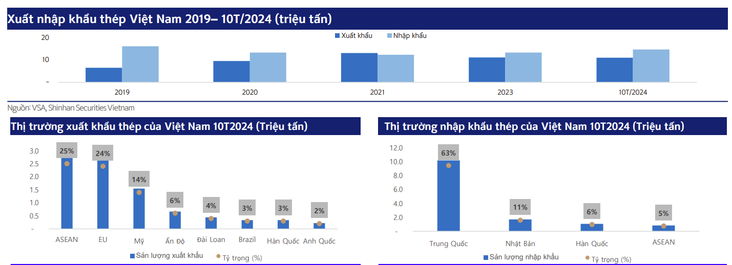 - Trong 10 tháng đầu năm 2024, tổng sản lượng xuất khẩu thép Việt Nam tăng, đạt 11.02 triệu tấn,+21% YoY.