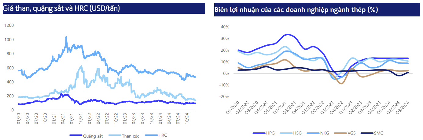 - Trong Q4/2024, giá than cốc và quặng sắt đã giảm lần lượt 15%QoQ và 6% QoQ, giá thép giảm 8% QoQ. Qua đó, biên lợi nhuận của các doanh nghiệp ngành thép được dự báo sẽ giữ ổn định trong Q4/2024.