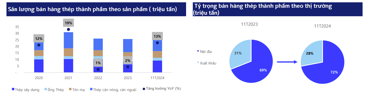 - Sản lượng tiêu thụ thép thành phẩm trong nước ghi nhận phục hồi tích cực trong 11T2024 với động lực chính từ thị trường nội địa