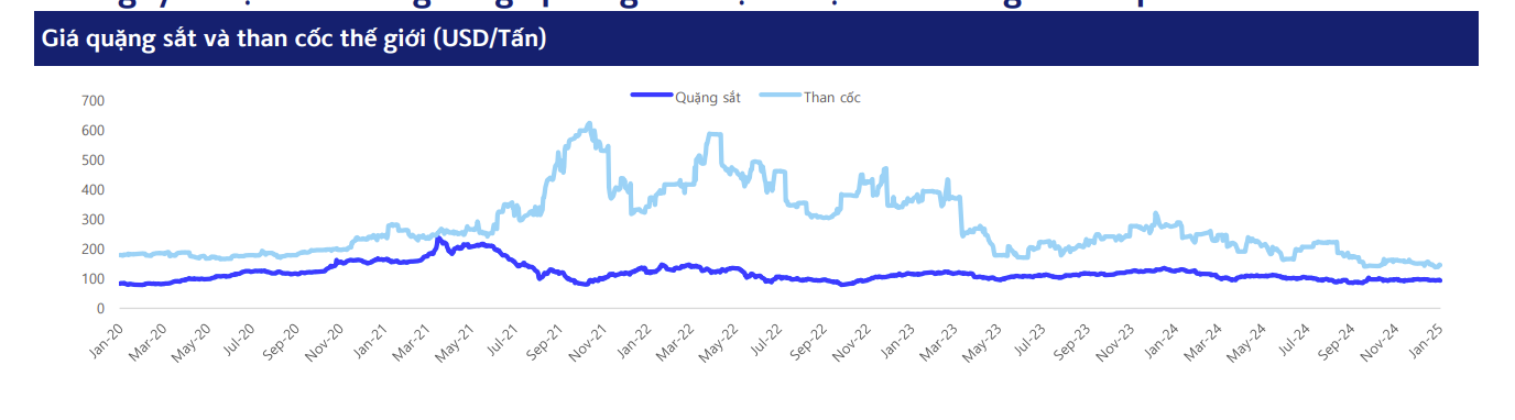 - Chúng tôi cho rằng giá than cốc và quặng sắt sẽ tiếp tục neo ở mặt bằng thấp trong năm 2025, ) với kỳ vọng tăng nguồn cung xuất khẩu tại Úc và nhu cầu sản xuất thép tại Trung Quốc tiếp tục suy yếu trong năm 2025.