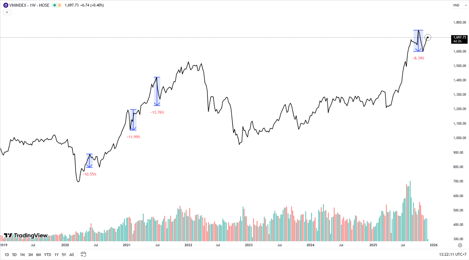 Trong 2 chu kỳ tăng giá gần nhất giai đoạn 2020– 2022 và 2016-2018, VN-Index cũng đã chứng kiến nhiều nhịp điều chỉnh mạnh. Theo như thống kê xuất trong hình, những nhịp giảm 10–15% hoàn toàn có thể xuất hiện trong một xu hướng tăng dài hạn, thậm chí là điều kiện cần để thị trường tái tạo mặt bằng giá mới.