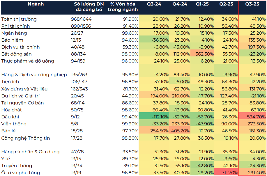 Dữ liệu cho thấy lợi nhuận toàn thị trường tăng hơn 41% YoY trong Q3, nhưng mức tăng không đồng đều giữa các nhóm ngành, khiến dòng tiền phản ứng phân hóa rõ rệt. Ở những nhóm đã tăng nóng trước đó, chẳng hạn ngân hàng hay bán lẻ, dù lợi nhuận vẫn tăng lần lượt 25% và 31%, nhiều cổ phiếu lại chịu áp lực chốt lời do kỳ vọng tích cực đã được phản ánh phần lớn vào giá.