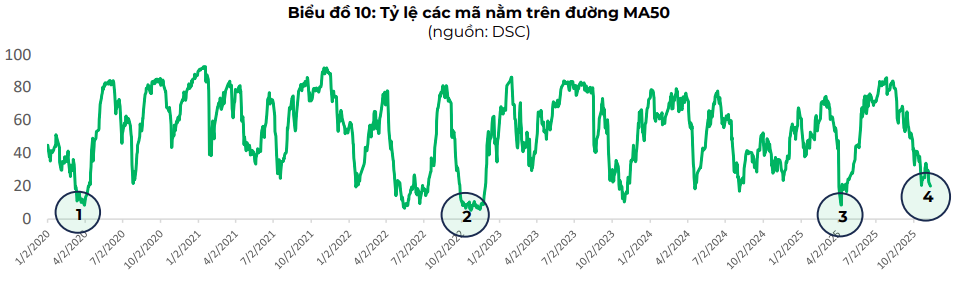 Một yếu tố khác mà mình phân tích là tỷ lệ % các mã cổ phiếu có giá trên trung bình 50 phiên, hiện nay cũng đang cho thấy dấu hiệu chạm “vùng đáy” (vùng số 4 trên biểu đồ 9).