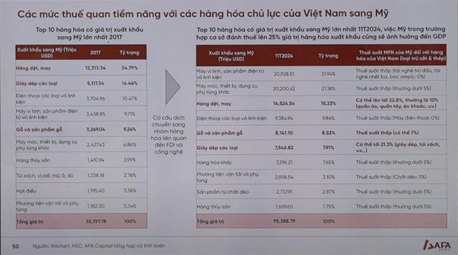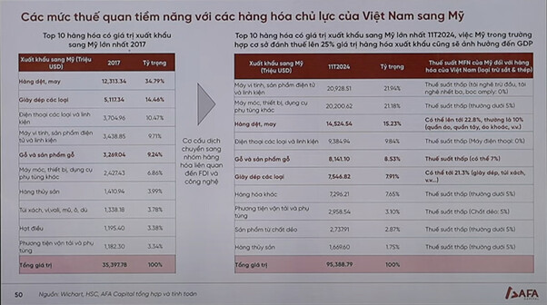 Các hàng hoá xuất khẩu từ Việt Nam vào Mỹ đã có sự chuyển dịch lớn nếu chúng ta so sánh với năm 2017 (cuộc thương chiến lần 1). Hiện tại, các mặt hàng chiếm tỉ trọng lớn nhất là máy tính, linh kiện điện từ và các thiết bị phụ tùng. Đây cũng là sự chuyển dịch của dòng chảy thương mại thế giới khi nhiều tập đoàn sản xuất công nghệ đặt nhà máy tại Việt Nam với lợi thế: Nhân công rẻ, nằm trong nhiều thoả thuận thương mại quốc tế, chính trị và luật pháp nhất quán, minh bạch. Mặc dù nhóm phải chịu thuế suất thấp nhưng rủi ro bị áp thuế trong tương lai là có với lý do là nguyên nhân chính dẫn đến thâm hụt thương mại của Hoa Kỳ. Nhóm ngành dệt may và giày dép các loại có thể phải chịu mức thuế lên đến 22.8% trong thời gian tới, và sẽ ảnh hưởng tiêu cực lên cổ phiếu những công ty may mặc.
