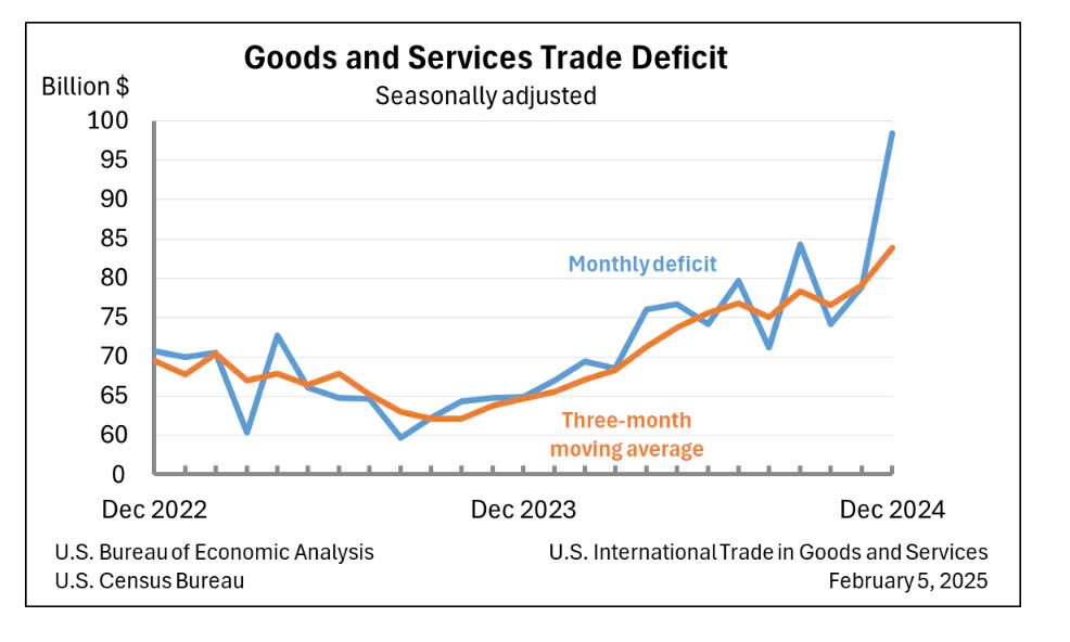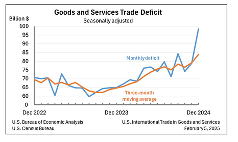 Đường màu xanh thể hiện thậm hụt thương mại của Mỹ qua từng tháng và đường kẻ cam thể hiện trung bình thâm hụt thương mại của Mỹ trong 3 tháng gần nhất. Chúng ta có thể thấy cuối nhiệm kỳ tổng thống Biden, mức độ thâm hụt thương mại của quốc gia ngày càng gia tăng với một tốc độ chóng mặt. Riêng trong tháng 12, con số thâm hụt thương mại của Mỹ đã gia tăng đến gần $100 tỷ. Vì vậy, rất dễ hiểu nếu một nhà kinh tế như ông Trump đánh thuế nhiều quốc gia trên thế giới, thậm chí đồng minh của Mỹ, để lấy lại vị thế về kinh tế cũng như chính trị của họ.