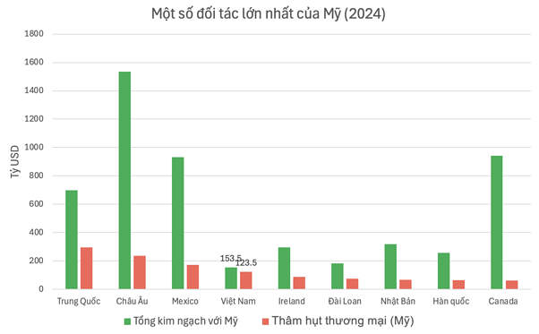 Trong bảng thông kê trên, chúng ta có thể thấy Việt Nam nằm top 3 quốc gia có thặng dư thương mại (là thâm hụt cho phía Mỹ) lớn nhất. Tổng kim ngạch xuất nhập khẩu của nước ta với Mỹ là $153.5 tỷ trong năm 2024, tuy nhiên thặng dư lên tới $123.5 tỷ. Điều này đồng nghĩa với việc họ đang tiêu thụ rất nhiều hàng Việt Nam ($138.5 tỷ), tuy nhiên chúng ta chỉ mua lại của họ $15 tỷ hàng hoá. Các quốc gia khác trong bảng này dù có thặng dư nhiều hơn hay ít hơn Việt Nam đều có tổng kim ngạch vượt trội. Điều đó có nghĩa rằng giá trị hàng nhập từ Mỹ của họ cũng gấp Việt Nam nhiều lần, và cho tổng thống Trump thêm nhiều lý do để áp thuế lên Việt Nam nếu nhà điều hành của chúng ta không có những giải pháp trong tương lai gần.