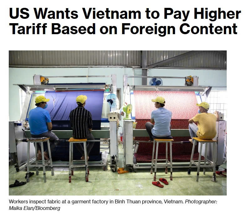 Bloomberg cho biết như bài báo, mức thuế thấp nhất 10% ( 10% cũ + 10% mới) dành cho hàng hóa xuất xứ hoàn toàn Việt nam; mức thuế trên 20% ( 10+20%) dành cho hàng hóa có xuất xứ nước ngoài cao.