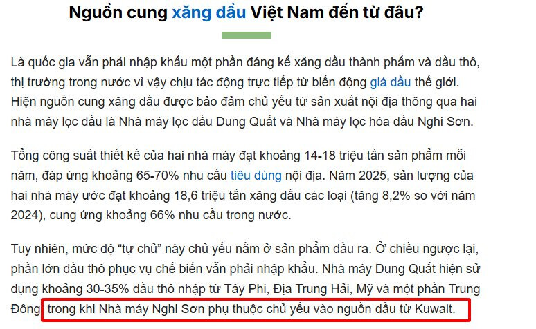 Mặc dù Việt Nam có khai thác dầu thô trong nước, nhưng cơ cấu vận hành của các nhà máy lọc dầu lớn vẫn phụ thuộc đáng kể vào nguồn nguyên liệu nhập khẩu từ Trung Đông. Hiện nay, hai nhà máy lọc dầu lớn là Nhà máy lọc dầu Nghi Sơn và Nhà máy lọc dầu Dung Quất đang đáp ứng khoảng 72–80% nhu cầu xăng dầu trong nước. Tuy nhiên, hoạt động của các nhà máy này vẫn chịu tác động từ chuỗi cung ứng toàn cầu do phụ thuộc vào dầu thô nhập khẩu. Trước những căng thẳng địa chính trị hiện nay, mỗi đơn vị đang xây dựng các kịch bản ứng phó riêng. Theo Công ty cổ phần Lọc hóa dầu Bình Sơn – đơn vị vận hành Nhà máy lọc dầu Dung Quất, doanh nghiệp đã chủ động các phương án sản xuất để bảo đảm nguồn cung xăng sinh học cho thị trường trong nước. Doanh nghiệp cho biết từ cuối tháng 3/2026, nhà máy Dung Quất dự kiến tiếp nhận khoảng 60.000 tấn nhiên liệu sinh học E100 từ Nhà máy Nhiên liệu sinh học dầu khí Miền Trung để pha chế thành xăng E10. Giải pháp này nhằm góp phần gia tăng sản lượng xăng dầu trong nước trong bối cảnh các kênh nhập khẩu bị hạn chế do một số quốc gia siết xuất khẩu xăng dầu. Trong khi đó, Nhà máy lọc dầu Nghi Sơn chịu áp lực lớn hơn do nguồn dầu thô từ Kuwait phải đi qua Eo biển Hormuz – khu vực được xem là “điểm nóng” an ninh hàng hải. Hiện các lô hàng trong tháng 3 vẫn cập cảng an toàn để duy trì sản xuất. Tuy nhiên, nếu xung đột kéo dài sang tháng 4, nhà máy này có thể đối mặt nguy cơ thiếu hụt nguyên liệu và buộc phải tìm kiếm nguồn cung thay thế để đảm bảo an ninh năng lượng quốc gia.