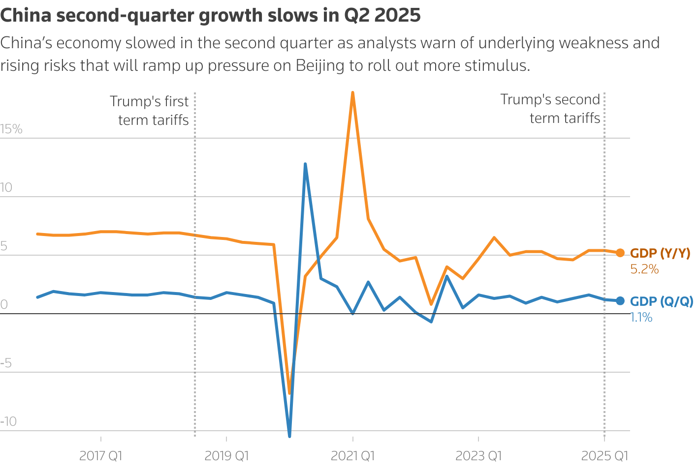 Khảo sát của Reuters dự báo tăng trưởng GDP sẽ giảm xuống 4,5% trong quý III và 4,0% trong quý IV, với dự báo tăng trưởng năm 2025 đạt 4,6% – thấp hơn mục tiêu chính thức. Quỹ đạo này nhấn mạnh môi trường đầy thách thức mà các nhà hoạch định chính sách Trung Quốc đang đối mặt khi phải cân bằng giữa ổn định trong nước và áp lực bên ngoài.