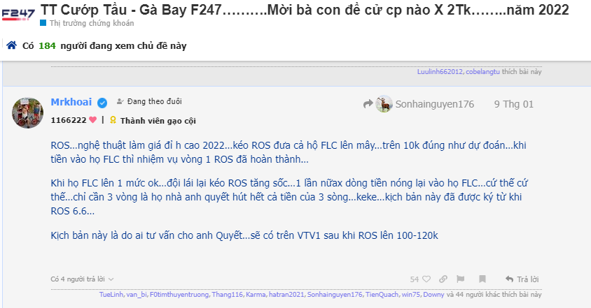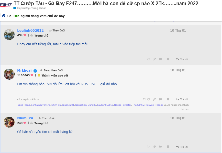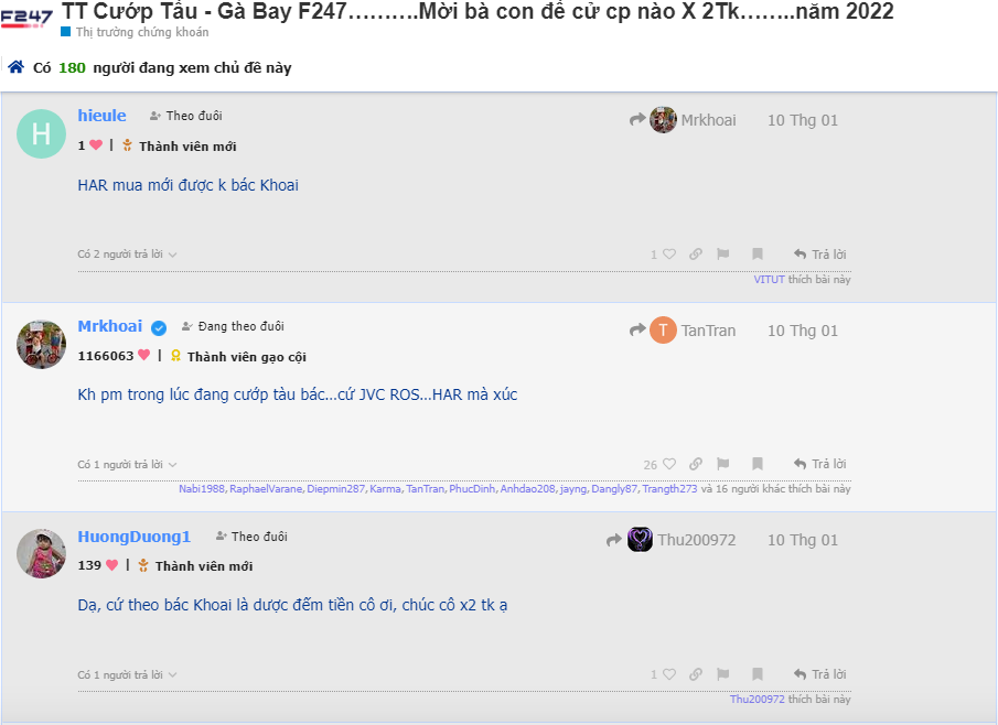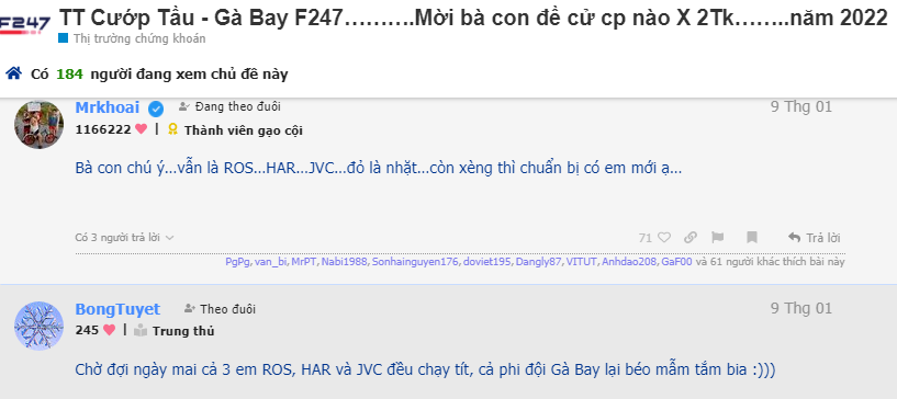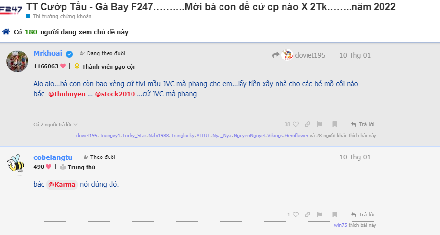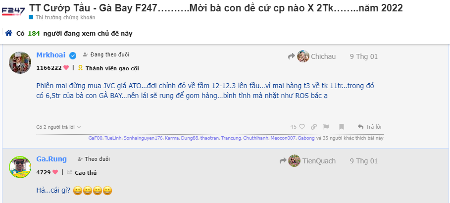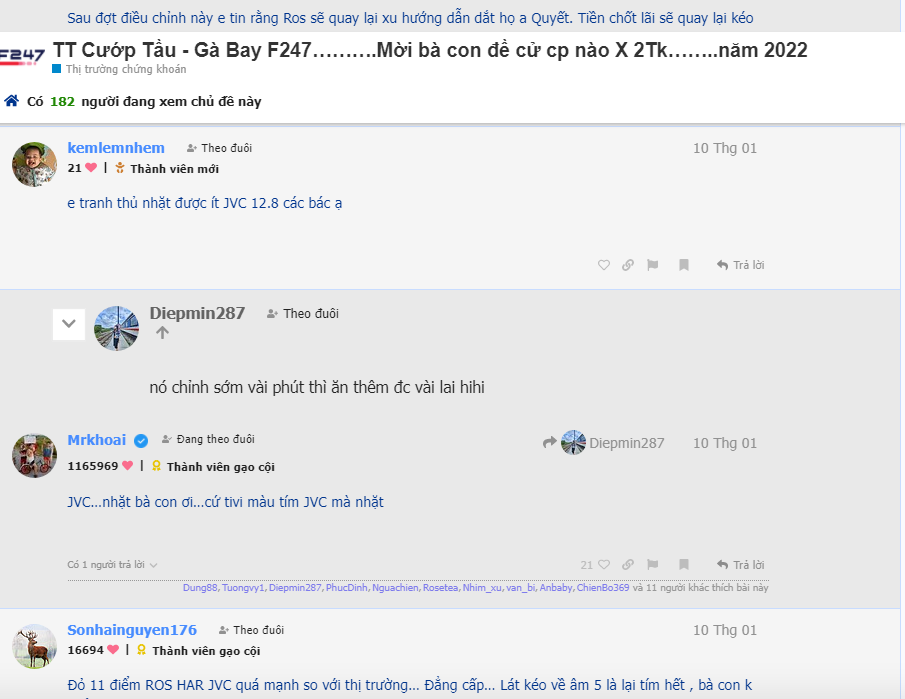 “Bác nào còn bao nhiêu xèng mua JVC tất tay cho em … bao lỗ” Ngày 9/1 khuyến nghị lên tàu JVC giá 12, 12.3 không phải lùa gà đu đỉnh thì là gì. Đã bao lỗ thì trả tiền cho bà con đi bằng không thì xóa tài khoản.