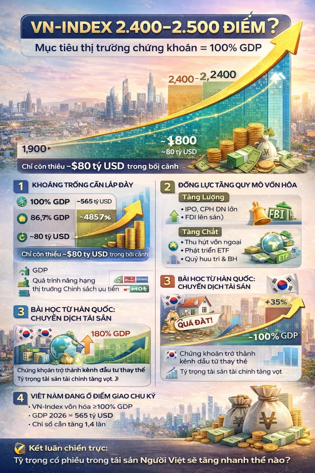 Nếu điều đó xảy ra, mục tiêu vốn hóa 100% GDP không còn là tham vọng chính sách, mà trở thành hệ quả tự nhiên của một chu kỳ phân bổ tài sản mới.