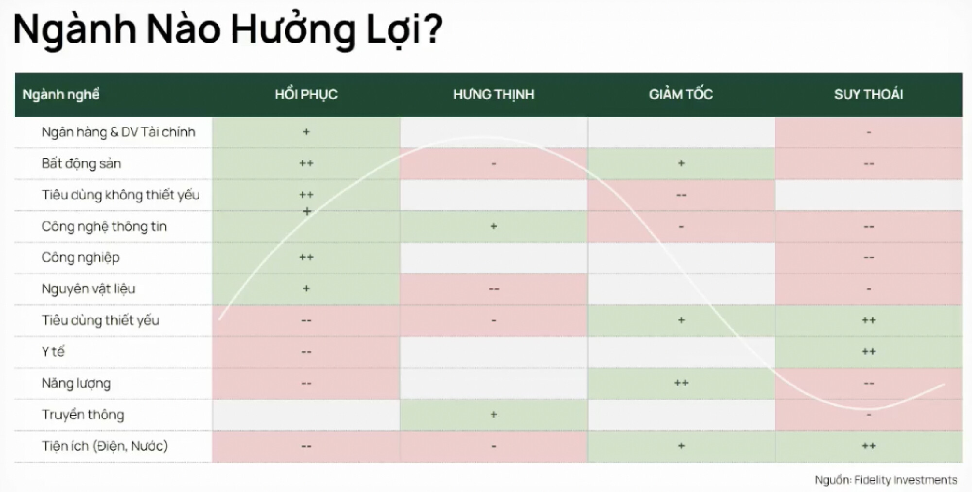 "Trong chu kỳ hồi phục, những ngành beta cao, biến động lớn sẽ có hiệu suất tốt, đơn cử như tiêu dùng không thiết yếu, bất động sản, tài chính ngân hàng sẽ tăng trưởng và mang đến lợi nhuận cao. Ngược chiều, những nhóm ngành như tiêu dùng thiết yếu, y tế, năng lượng, tiện ích như điện nước khả năng sẽ có hiệu suất thấp hơn trong chu kỳ này" , chuyên gia Dragon Capital nhận định.
