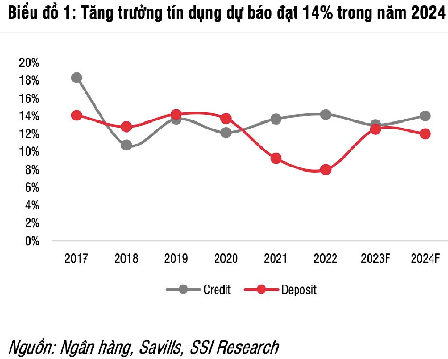 Trong báo cáo phân tích về triển vọng ngành ngân hàng, SSI Research kỳ vọng tăng trưởng tín dụng sẽ phục hồi lên mức 14%. Điều này được hỗ trợ một phần bởi lãi suất cho vay giảm. Dư địa tăng trưởng có thể sẽ đến từ khối doanh nghiệp như: (i) ngành xây dựng cơ sở hạ tầng; (ii) doanh nghiệp sản xuất và FDI; và (iii) các ngành nghề được ưu tiên (như nông nghiệp, xuất khẩu, công nghệ cao, SME và công nghiệp bổ trợ).