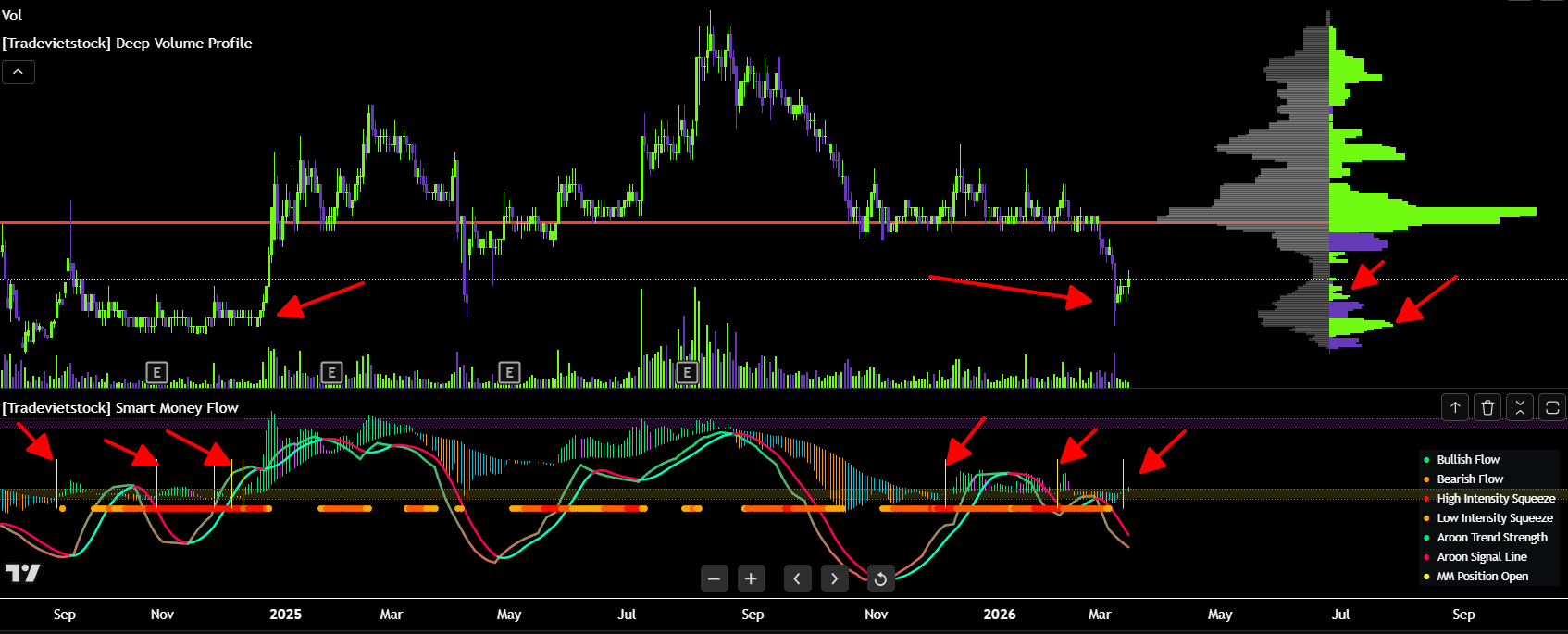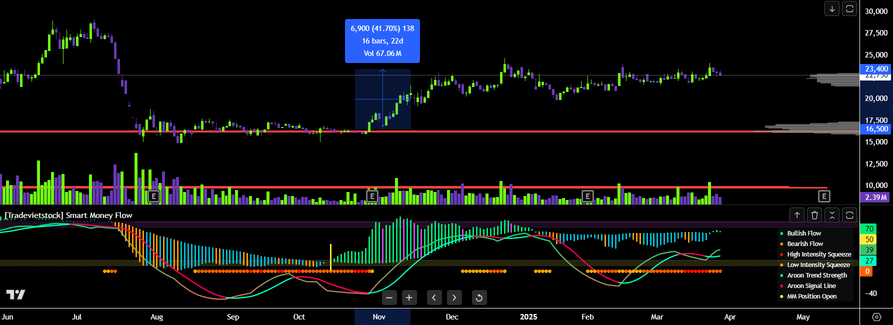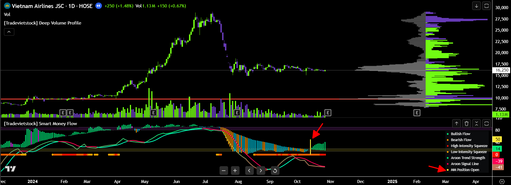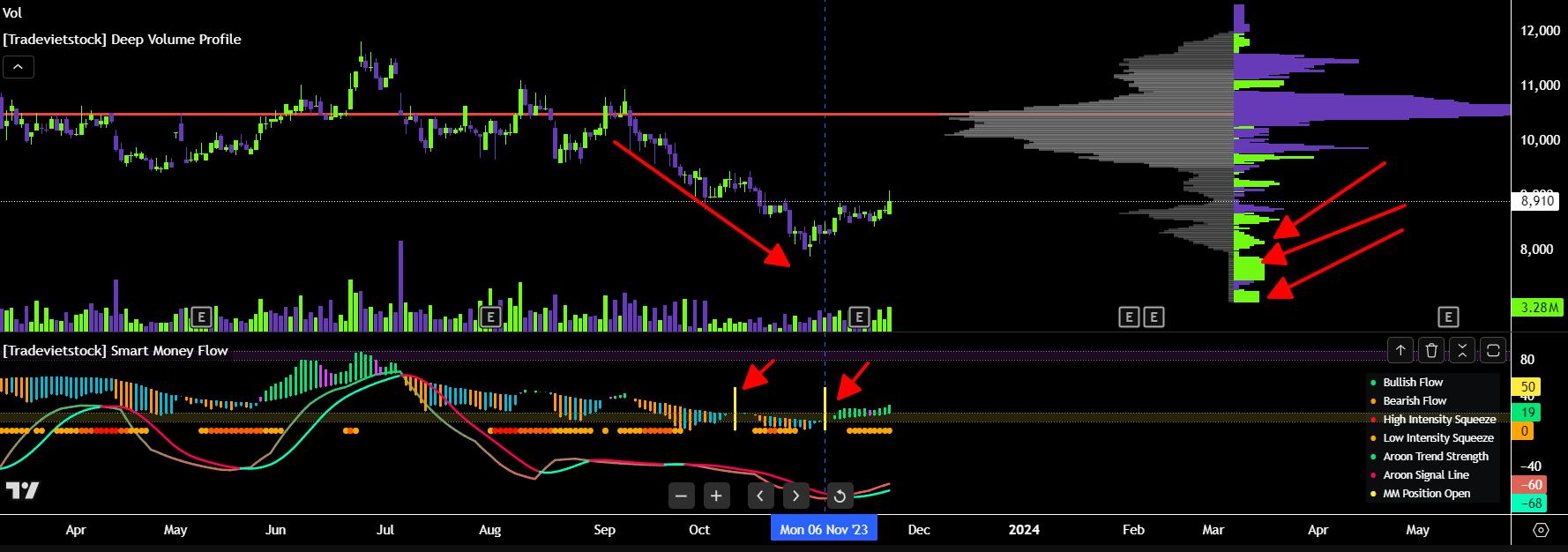 Sau giai đoạn đó mới có dấu hiệu lực bán cạn dần và bị hấp thụ, kế đó là cột MM position open xuất hiện, đại ý là dòng tiền lớn bắt đầu đẩy mạnh đó cả nhà, sau đó thì HVN tăng tầm 40 50% thôi