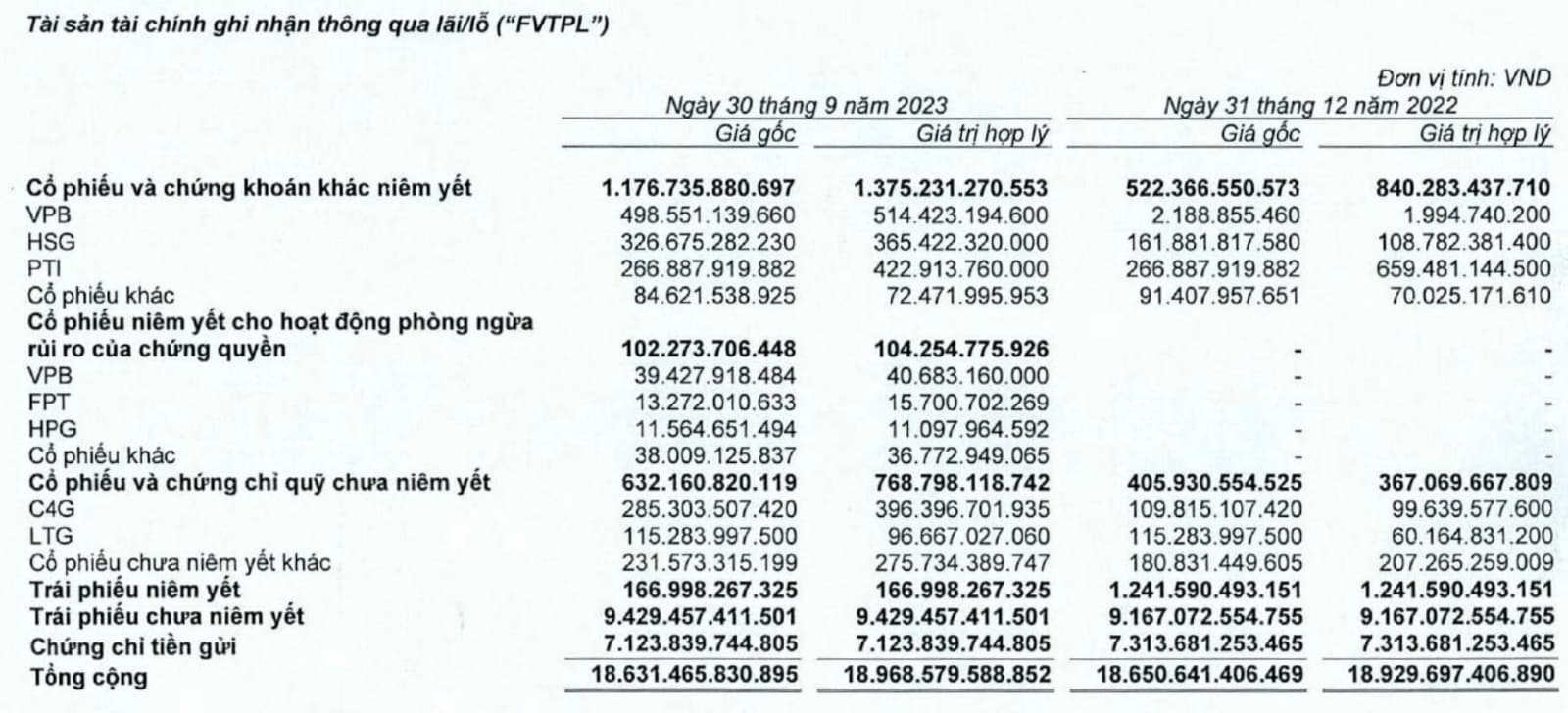 Trong khi đó, khoản mục cổ phiếu, chứng chỉ quỹ niêm yết và chưa niêm yết có giá gốc giảm nhẹ xuống 1.809 tỷ nhưng giá trị hợp lý lại nhích nhẹ lên hơn 2.144 tỷ đồng. Trong quý 3, VNDirect đã mạnh tay mua thêm cổ phiếu VPB (292 tỷ đồng) và HSG (160 tỷ đồng). Cả 2 cổ phiếu này đều đang tạm lãi nhẹ vào cuối quý 3.