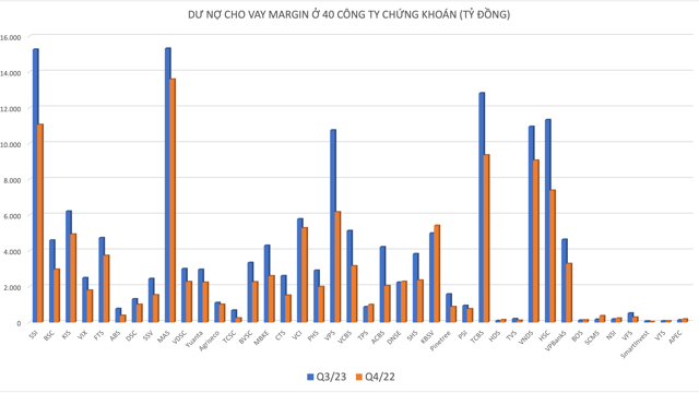 Ước tính ở 50 công ty chứng khoán, con số này rơi vào khoảng hơn 156.000 tỷ đồng. Như vậy, so với thời điểm dư nợ margin đạt đỉnh vào Q1/2022 (184 nghìn tỷ đồng), dư nợ cuối tháng 9 thấp hơn 28.000 tỷ đồng.