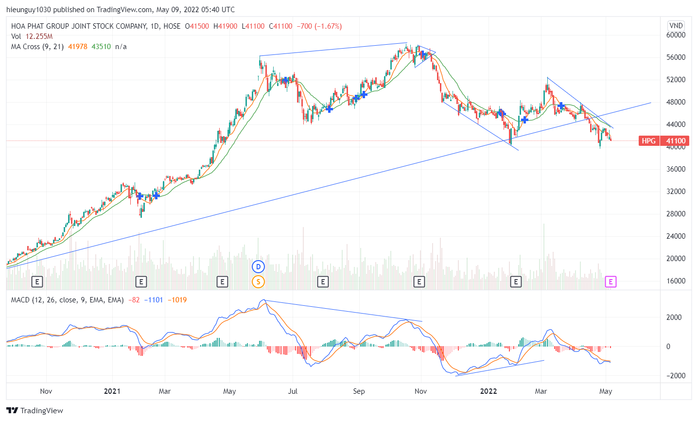 Chu lay thi du HPG: Between the two top 4/2021 va 10/2021 (negative MACD divergence), bat dau vao down trend. Thi 4 cai low thang 11, 12, va thang gieng 2022 cung se co positive divergence, roi moi co cu hoi ABC thang 2,3 duoc. HPG la leading indicator cho VNI, thuong di truoc 1,2 thang.
